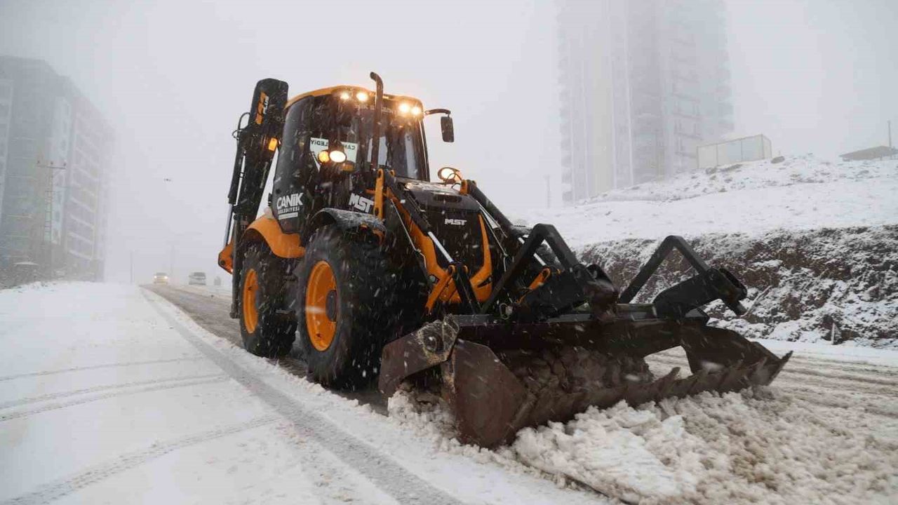 Samsun'un Canik Belediyesi, ilçenin yüksek kesimlerinde etkili olan kar yağışına karşı sahada çalışmalarına yoğun bir şekilde devam ediyor.
