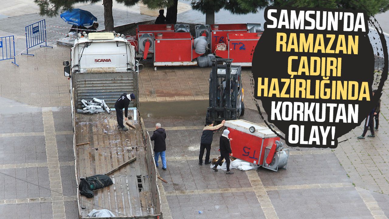 Samsun Cumhuriyet Meydanı'nda tırdan indirilen havalandırma ünitesinin devrilmesi paniğe neden oldu. İş kazasında şans eseri yaralanan olmadı.
