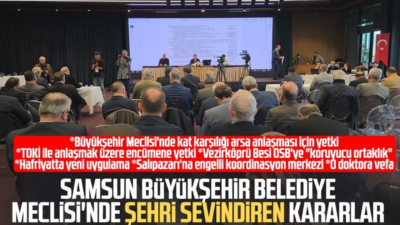 Oturumda kat karşılığı arsa anlaşmaları için yetki verilmesi, TOKİ ile takas ve protokol süreçleri, Vezirköprü Besi OSB’ye koruyucu ortaklık, hafriyat dökümünde yeni denetim uygulaması ve Salıpazarı’na Engelli Koordinasyon Merkezi kurulmasına yönelik başlıklar öne çıktı.