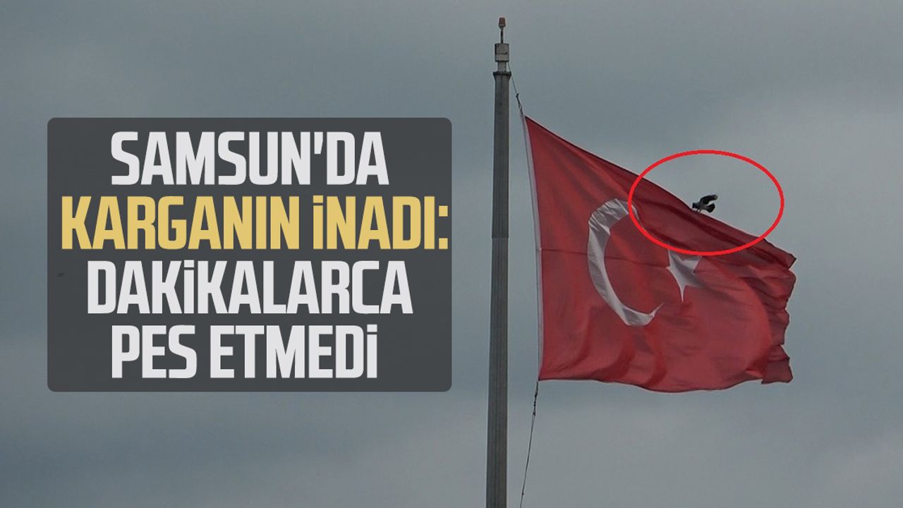 Rüzgârın etkisiyle defalarca havalanmak zorunda kalan karga, her seferinde yeniden dönerek bayrağın üzerine tutunmaya çalıştı.