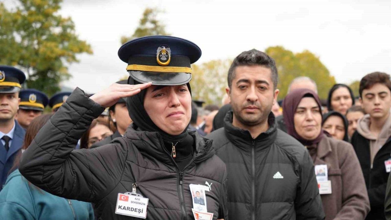 Gürcistan’da askeri uçağın düşmesi sonucu şehit olan Astsubay Üstçavuş Emre Altıok’un cenazesinde, polis olan kız kardeşinin ağabeyinin şapkasını takarak selam durup tabutunu okşadığı anlar yürekleri dağladı.
